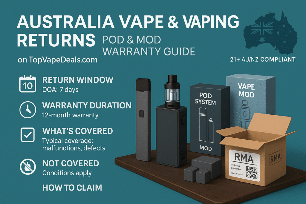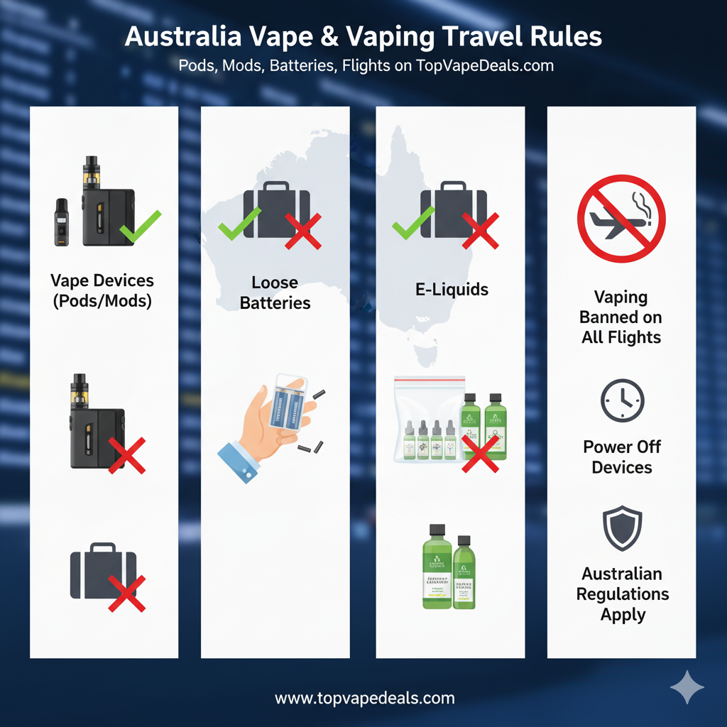 Australia Vape & Vaping Travel Rules — Pods, Mods, Batteries, Flights on TopVapeDeals.com Fly smarter with Australia vape & vaping travel rules on TopVapeDeals.com. See packing tips for pod & mod devices, batteries, chargers, and e-liquid. Adults 18+. No health claims. Always confirm current Australian airline, airport, and regulator guidance before traveling with nicotine products. […]