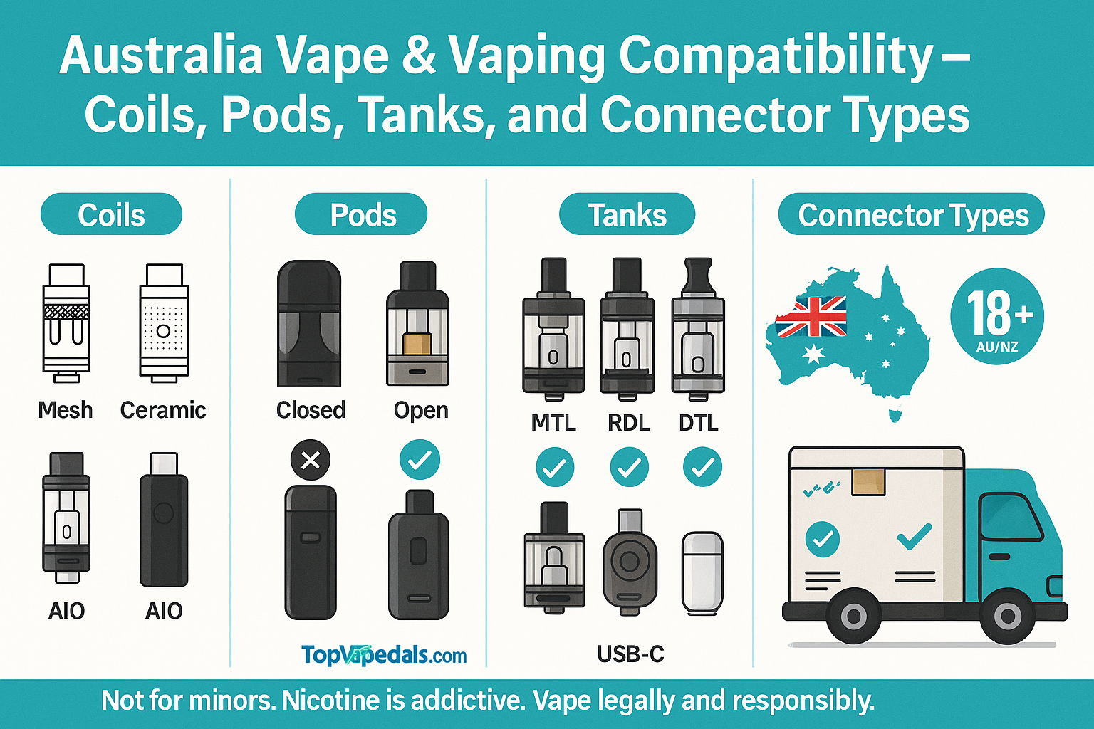 Australia Vape & Vaping Compatibility — Coils, Pods, Tanks, and Connector Types | TopVapeDeals.com