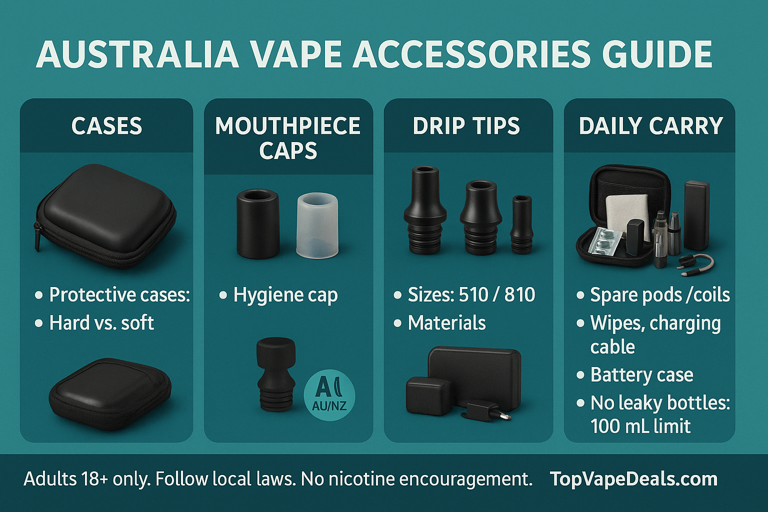 A practical Australia vape accessories guide for adults 18+. Compare carry cases, mouthpiece caps, drip tips (510/810), lanyards, desk mats, and spare parts. Build a clean daily carry, reduce leaks, and keep devices tidy with a short routine. Always verify Australian regulations before purchase or use.